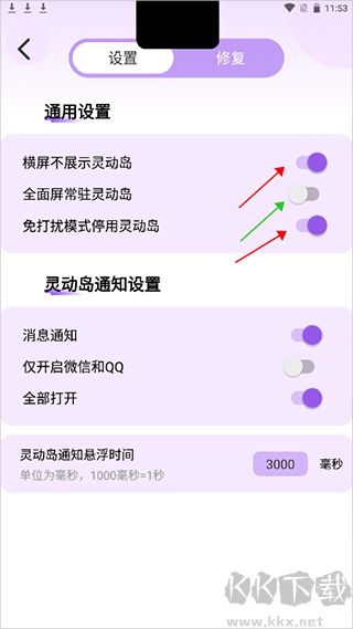1、用户开启灵动岛功能后可以在首页处点击【设置及修复】按钮