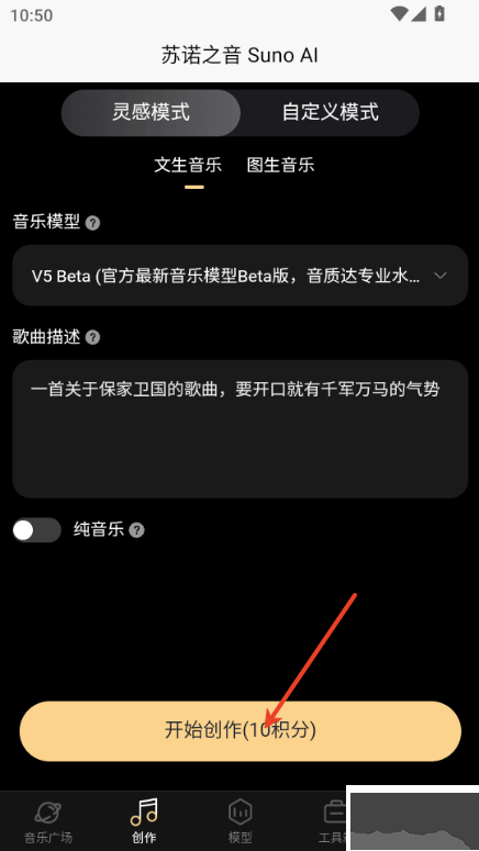 2、这里有灵感模式和自定义模式,之后对歌曲进行描述,就可以开始创作了;