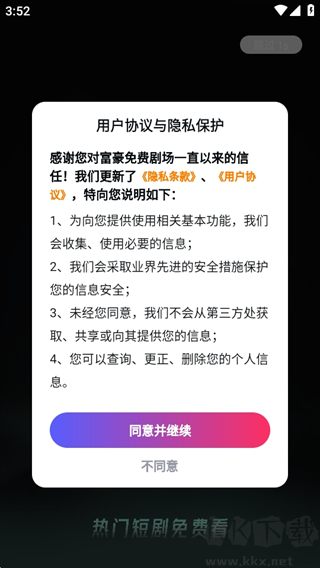 1、打开app,阅读用户隐私协议之后点击同意并继续即可进入;