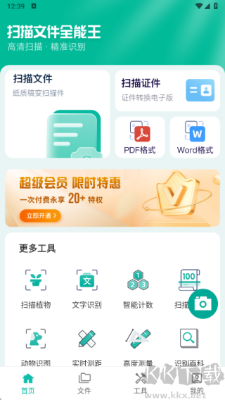1、首页提供扫描文件、扫描证件、转PDF/Word及更多工具入口。