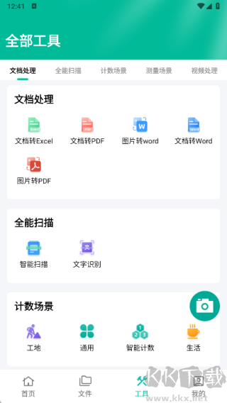 4、工具板块集成了文档处理、全能扫描、场景计数、测量和视频处理等多种功能。
