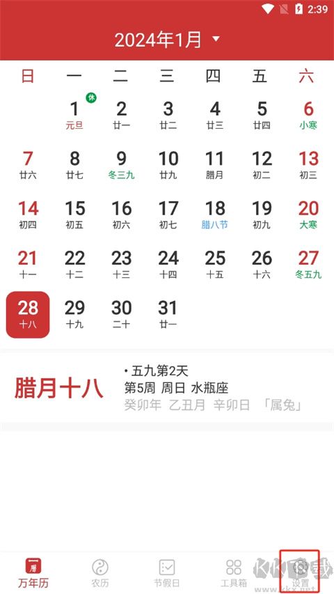 1、打开桔子万年历软件,点击右下角的设置;