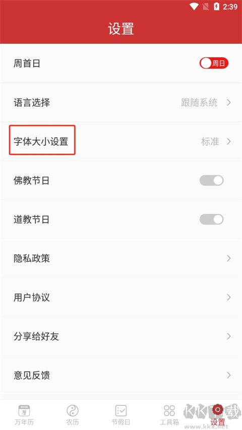 5、允许用户自选周一或周日作为每周起始日,按个人习惯灵活调整,同时支持调节字体大小;