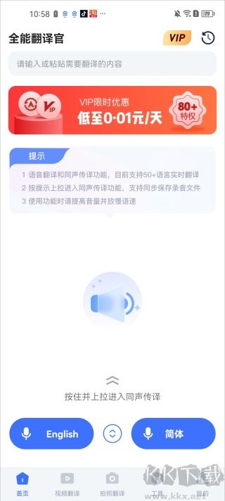 全能翻译官app是一款拥有很多功能的智能翻译软件,涵盖视频翻译、语音翻译、拍照翻译、同声传译和多民族语言互译等功能,支持全球主流语言与少数民族语言的精准双向转换。无论是实时对话、文本识别还是音视频内容处理,都提供高效准确的翻译服务,满足不同场景下的沟通需求。软件拥有三大主流翻译平台,拥有随身拍照翻译、智能语音识别、语音转文字等实用功能,采用先进的图像和语音识别模型,实现便捷智能的翻译体验。需要的朋友快来下载试试吧!