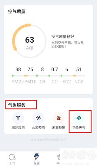 1、首先进入“专业天气”页面,在下方的“气象服务”区选择“钓鱼天气”;