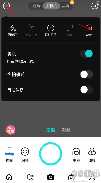 1、在拍摄界面点击左上角的三个点,再点击设置按钮。