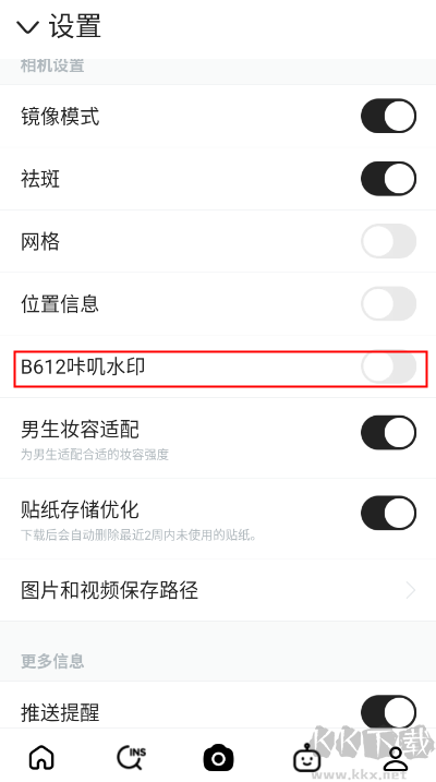 2、将B612咔叽水印功能关闭。