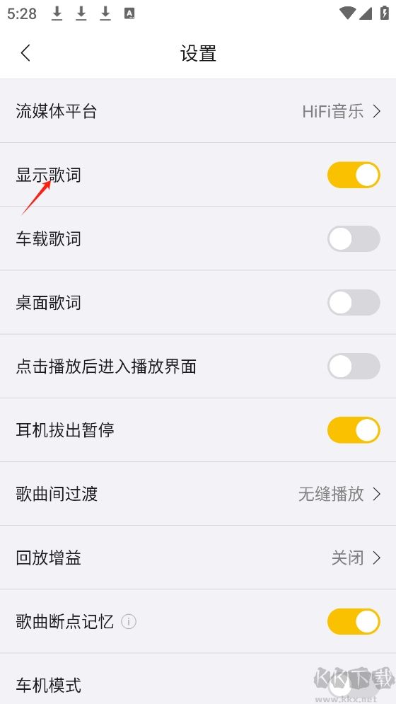 3、将显示歌词功能打开,播放音乐时就会显示歌词了