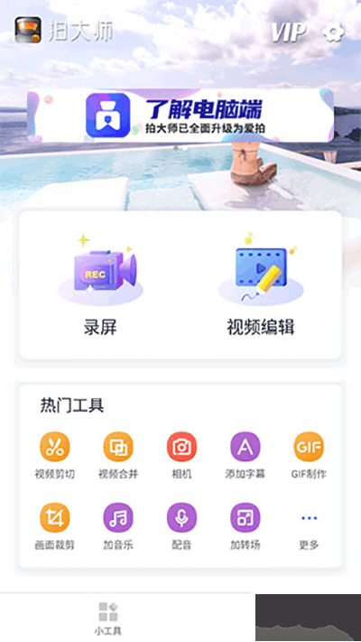 1、打开app进入页面,然后可以看到首页有两个选项,分别是录屏和视频剪辑,在主界面点击热门工具中的“视频剪辑”功能