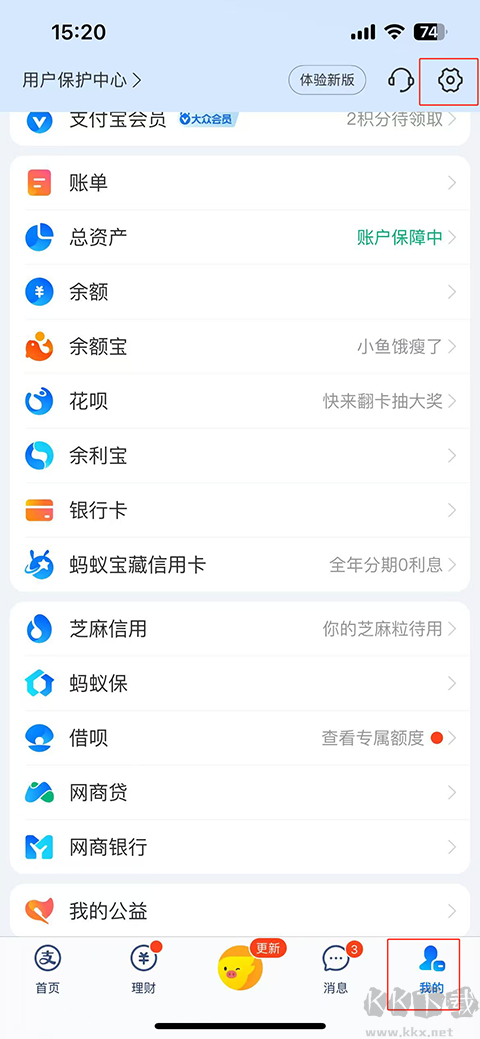 1、打开【支付宝】客户端,然后点击右下角【我的】,点击右上角【设置】图标。