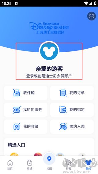 1、在打开上海迪士尼度假区APP之后,我们可以在“我得”里进行登录或创建账号,如下图所示。