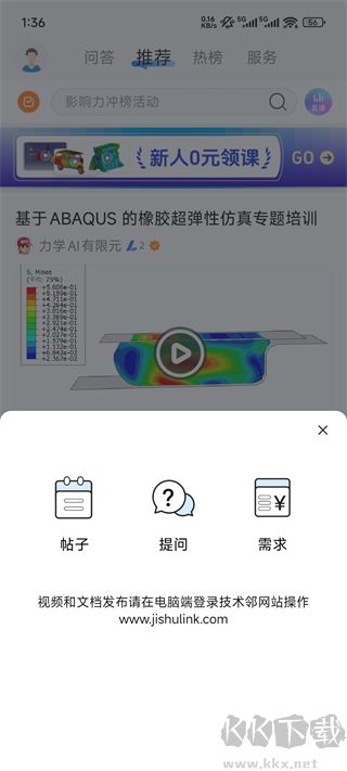 技术邻App是一款工科技术社区应用,覆盖力学、汽车、机械、材料、航空、交通运输、电子电气、通信、化工、能源、船舶、冶金、建筑土木、水利测绘等工科专业,以及海量的CAE仿真、CAD优化设计、3D打印等新技术应用内容,以及CAE仿真分析、CAD设计优化、三维打印等前沿程序,从业者可以在这提问解惑、参与项目协作,观看厂商直播、研习视频课程与实战案例,是工程人员交流观点、建立联系、展现专业能力的空间,推动技术实践与经验共享。