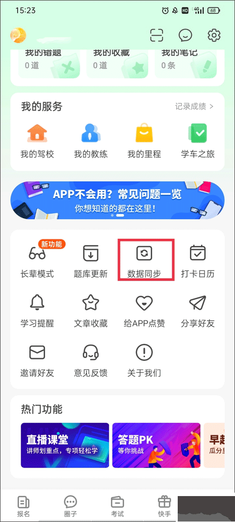 1、选择下方菜单栏【我的】界面,在下方你会看到很多的功能选项,如长辈模式、数据同步、题库更新等,点击“数据同步”。
