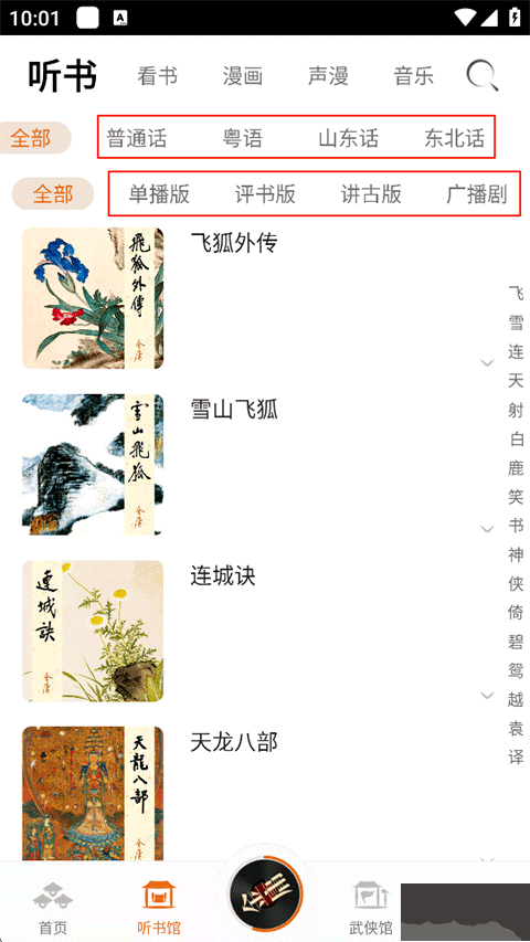 5、除了在首页搜索外,听书馆集成了各种书籍分类,从普通话到东北话,单播版到广播版,应有尽有;