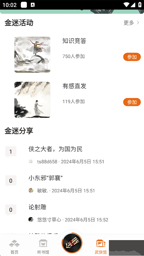 6、武侠馆功能页有各种金迷活动与金迷分享听书日常感悟,一起来参加讨论吧;