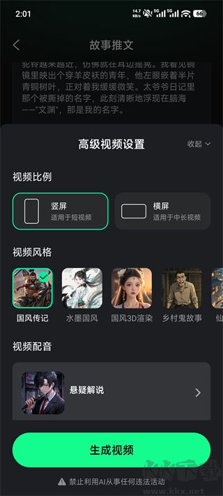 4、生成后进入高级视频设置,可选择视频比例、风格、配音后点击生成视频即可。