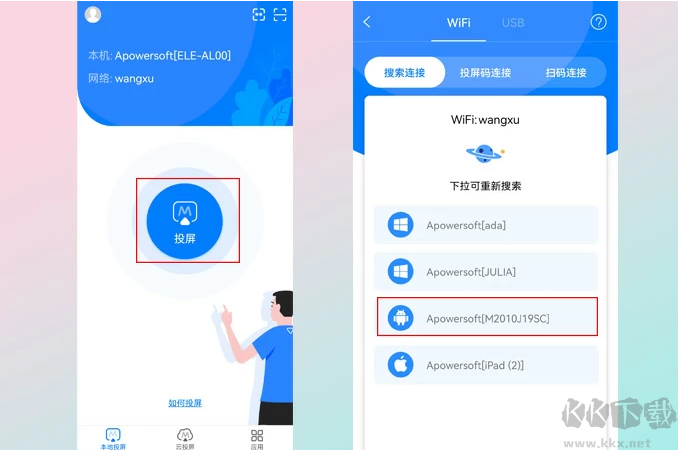 2、在傲软投屏App中,点击中间的【投屏】按钮。选择形如Apowersoft[设备名称]的待投屏设备。