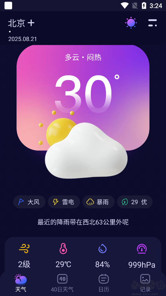超准天气预报app是一款提供实时精准天气信息的软件,准确性高、操作便捷、可以个性化定制的优势,帮助合理规划出行。拥有多方权威数据源,信息全面而且精准,无论是日常行程安排、外出旅行还是关注天气变化,都能提供可靠服务。软件还具备精准定位功能,特殊天气会提前发送预警信息,让你随时掌握天气动态。需要的朋友快来下载试试吧!