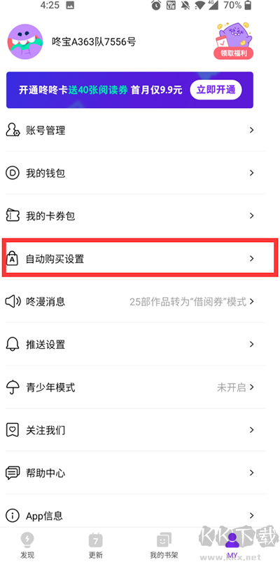 2、然后找到“自动购买设置”,找到相应自动购买的漫画取消即可。
