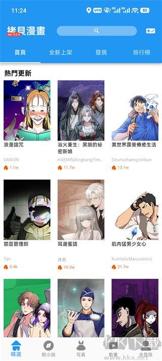 1、打开拷贝漫画App进入首页后,你会看到海量热门漫画内容,题材涵盖恋爱、奇幻、冒险等多种类型。你也可以通过搜索栏快速找到想看的漫画。
