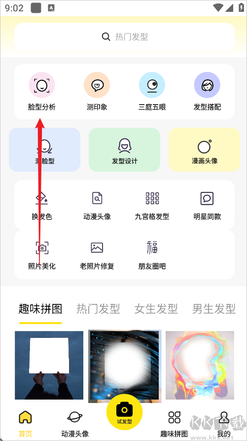 1、打开试发型相机在功能选项中,点击“脸型分析”;