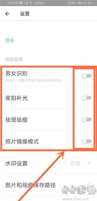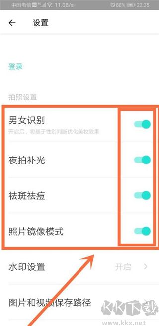 5、在设置界面依次启动性别识别、夜间补光、瑕疵修整及影像镜像功能。