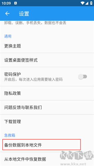 2、进入设置页面后,找到【急救箱】--【备份数据到本地文件】