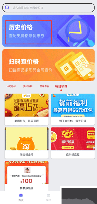 1、输入商品名称,即可查询各电商平台的实时售价、可用优惠券及历史价格走势。