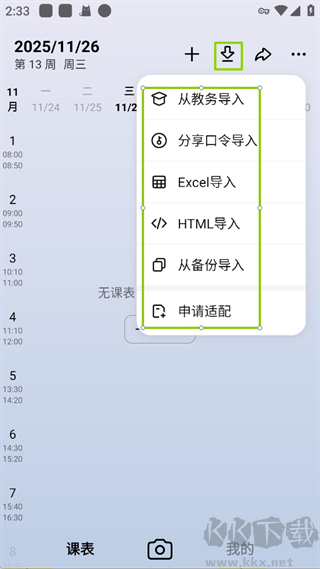 1、打开WakeUp课程表App,点击右上角【下载】图标,选择导入方式【支持从教务、分享口令、Excel 等多方式导入】。