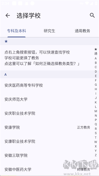 2、选择学校在【选择学校】页面,按分类找到对应学校,确认学校的教务系统类型。