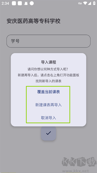 3、导入方式输入学号后,选择【覆盖当前课表、新建课表再导入】。