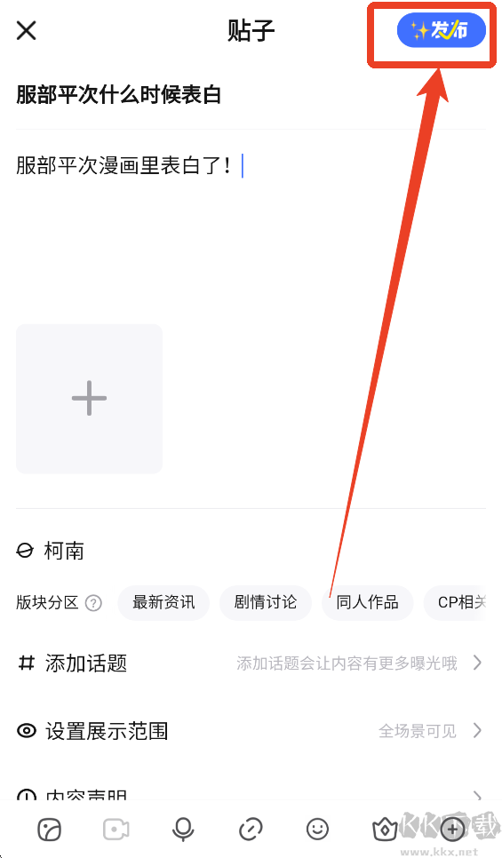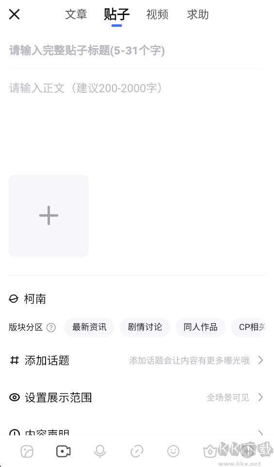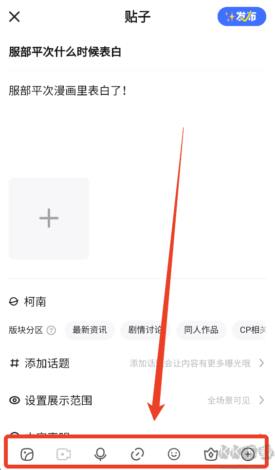 2、你可以输入帖子的标题、正文,添加图片和话题,选择版块,或者设置展示范围。