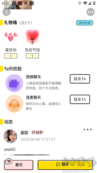 2、接着你可以查看他的个人资料,感兴趣的话可以点击聊天或者点击喜欢