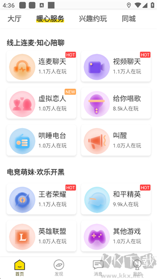 3、点击【暖心服务】这里有很多板块比如连麦聊天、视频聊天、虚拟恋人等等