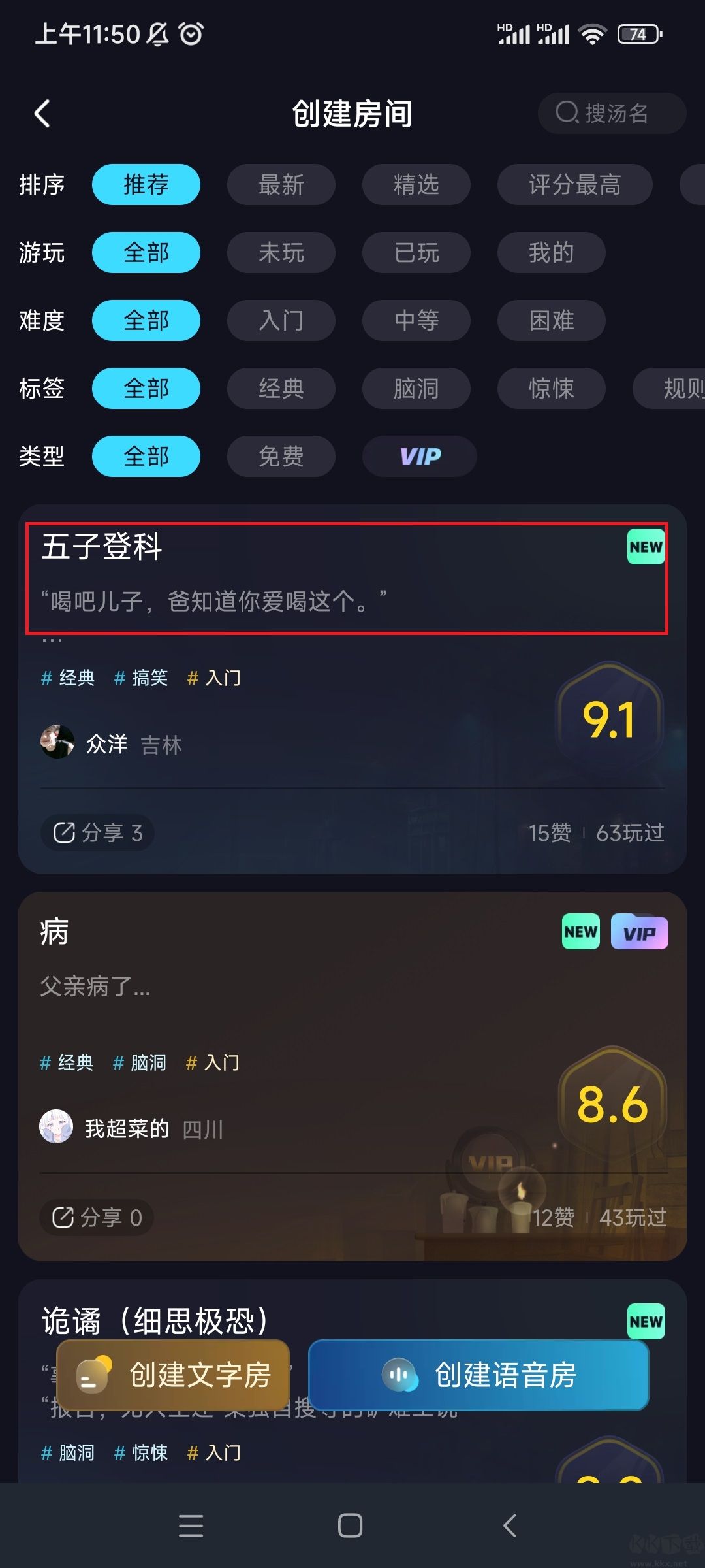 2、选择一个剧本,点击下方创建房间。
