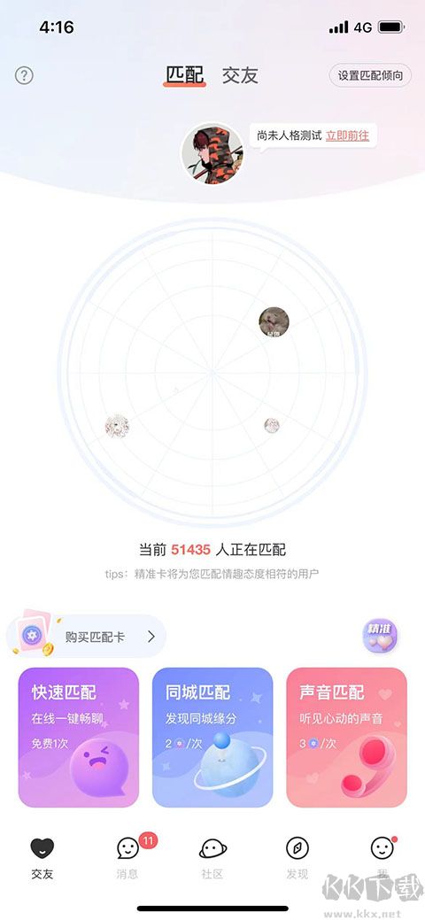 2、点击交友,用户可以快速匹配,同城匹配,声音匹配好友,还可以在线查看推荐好友。
