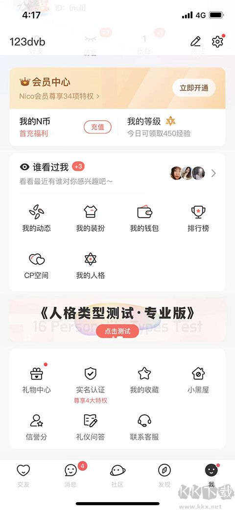 1、进入软件后,点击“我的” 在页面中间用户可以进行多种性格测试,测试完成后,系统就可以匹配相同爱好的好友。