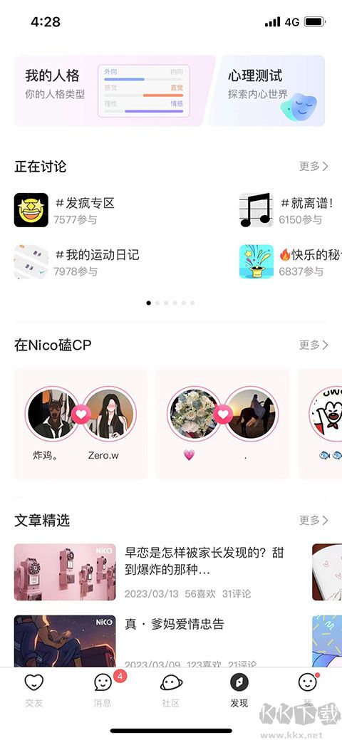 4、在发现栏目中用户查看自己的人格类型也可以进行心理测试,同时用户可以加入当前热门讨论专区进行讨论,还有多种文章精选让用户查看。