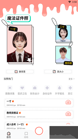 1、首页界面可以选择给证件照换背景,更改证件照的大小;