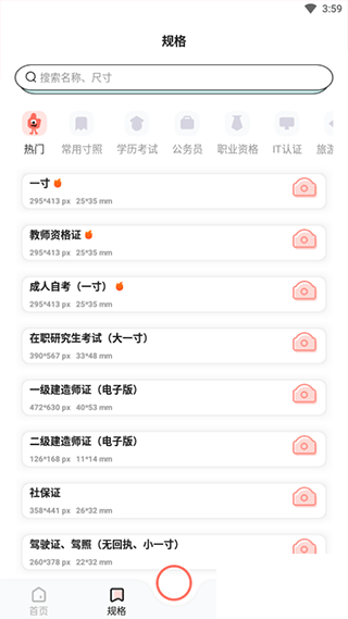 2、规格里面可直接搜素自己需要使用的尺寸大小,也可根据使用场景分类,如学历考试、公务员,职业资格,旅游签证等来找到相关尺寸;
