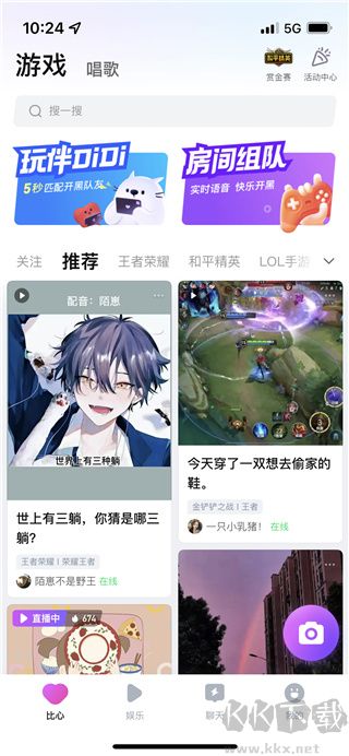 1、打开软件,在首页可点击玩伴DIDI,5秒匹配开黑队友,还有房间组队,实时语音,快乐开黑;