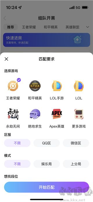 4、通过“快速进房”功能,选择游戏、区服、模式、段位,即可无需等待,秒速匹配。