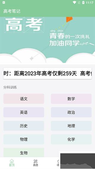 1、首页会显示高考倒计时,有语文、数学、英语、政治、历史、地理、物理、化学、生物的分科练习。