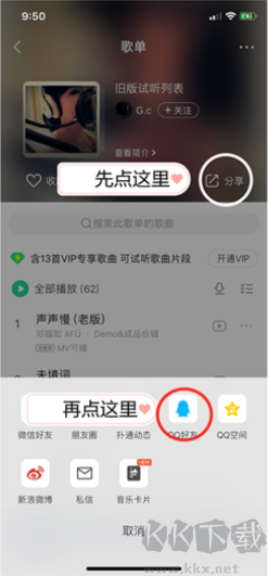 1、首先打开QQ音乐,进入自己的歌单页面,先点击“分享”,再发送给自己(或者别人都可以,只要需要歌单链接),然后在打开分享的链接