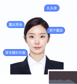 穿着整齐的衣服,避免穿帽衫、戴围巾和帽子等,尽量扎头发,露出耳朵,避免披发,建议化淡妆,保持微笑,避免露出牙齿。