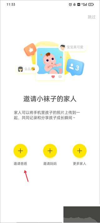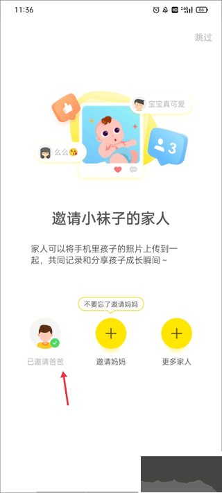1、进入app,给自己的小孩添加基本信息,添加成功后开始要请家人,你可以邀请爸爸和妈妈,也能点击更多家人;