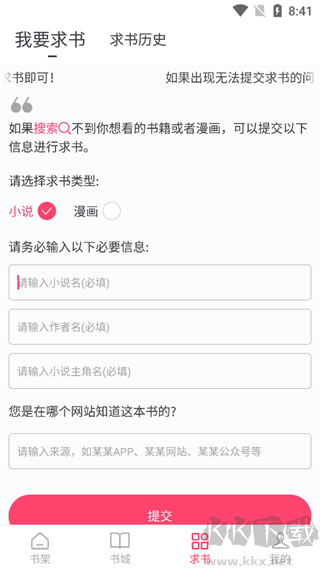 5、如果在软件查找不到你想看的内容,可以点击求书让作者去添加书籍