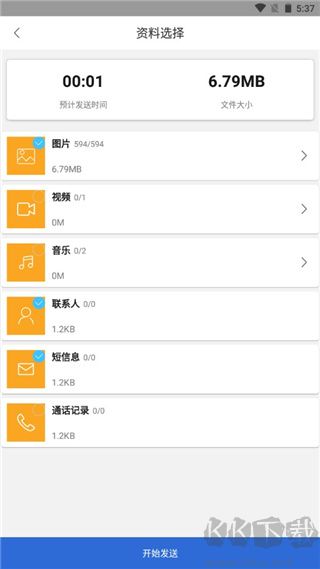 2、选择需要传输的图片、视频、联系人等文件,然后点击开始发送;