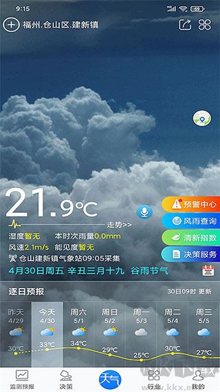 提供全国3000多座城市(福建省内含县市区级)当天的天气预报、实时天气状况、滚动更新的预警信息、一周天气预测、逐小时实况以及生活指数。
