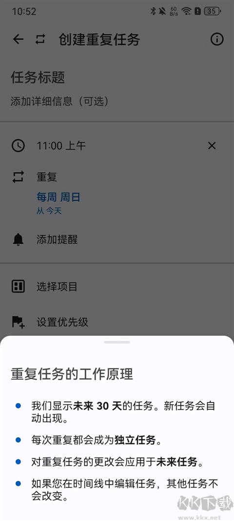 设置每日、每周或自定义时间表的重复任务。永远不要忘记日常活动。